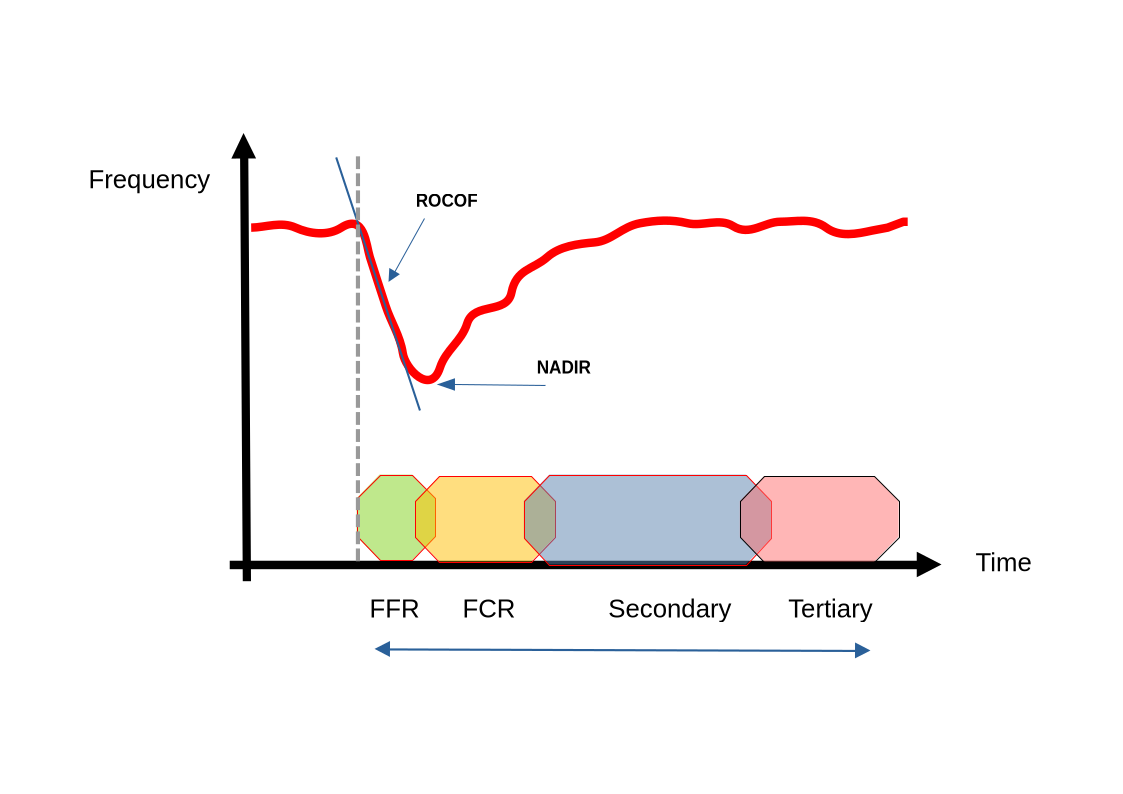 FFR (Fast Frequency Response/Reserve) can usually react in no less than 0.5 seconds based on the frequency drop. FCR (Frequency Containment Reserve), also known as Primary Reserve, takes at least a couple of seconds, usually around half a minute.